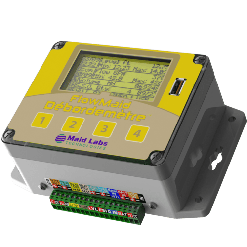 FlowMaid is a small open channel flow meter used to record level, volume and discrete events. Data is downloaded to a USB key or MaidMaps. No software required to produce reports. MaidMaps can activate a remote relay and display readings.